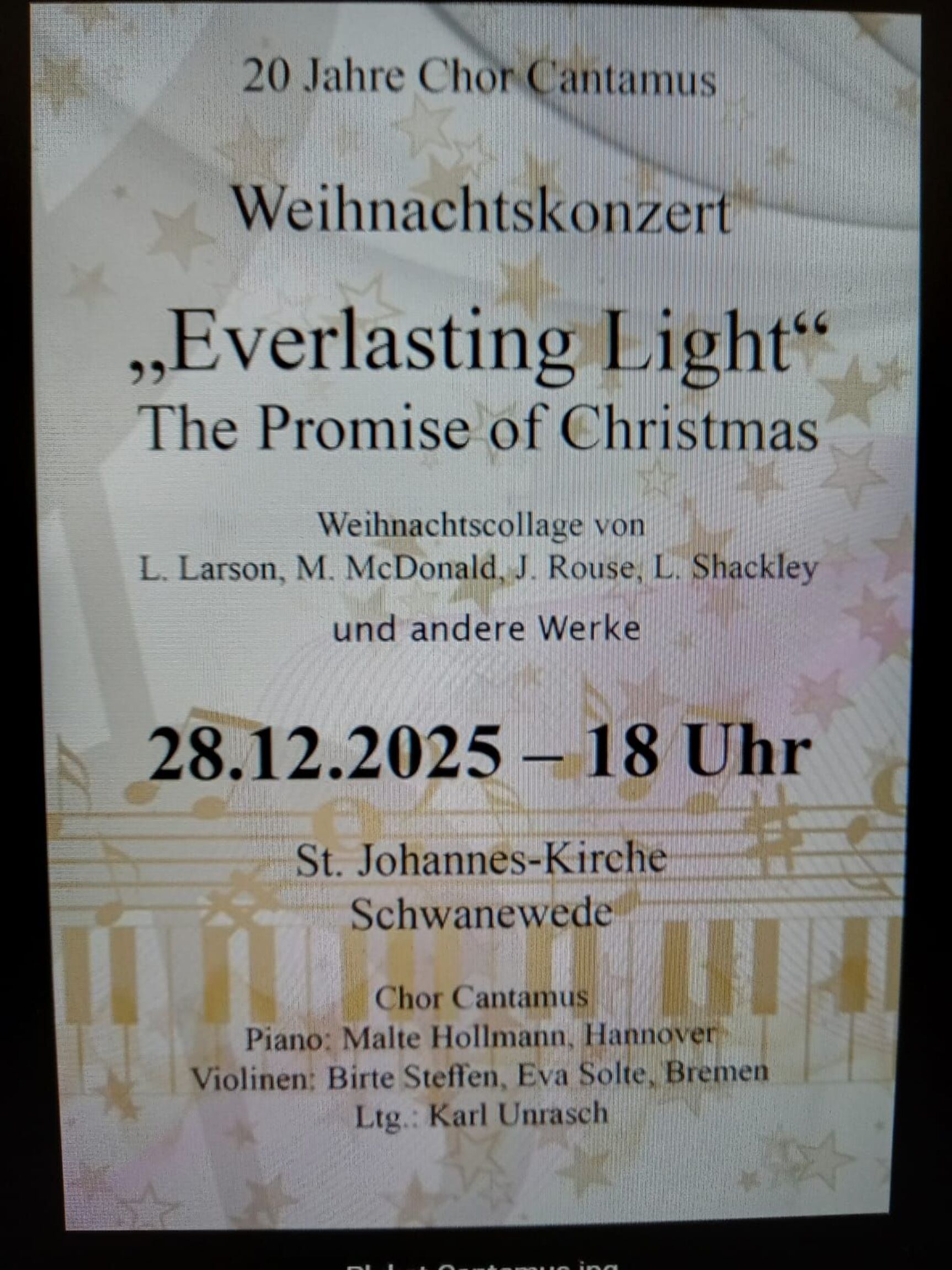 Der Chor Cantamus konnte im Jahr 2025 auf sein 20jähriges Bestehen zurückblicken und lädt aus diesem Grund zu einem Weihnachtskonzert am Sonntag, 28.12.2025 um 18.00 Uhr in der St. Johannes-Kirche ein.