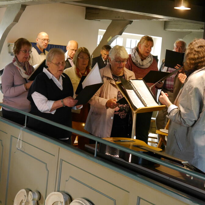 Kirchenchor mittwochs (außer erster Mittwoch im Monat), 19.00 Uhr, Gemeindehaus Ostlandstraße; Leitung: Karla Schwarz, Tel. 919146