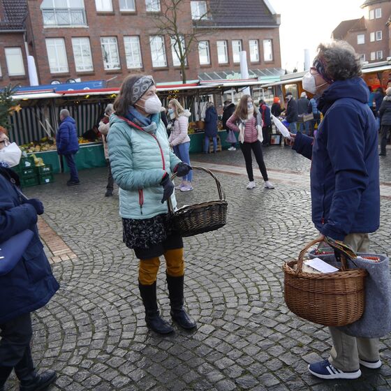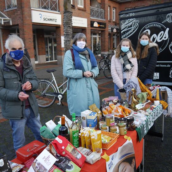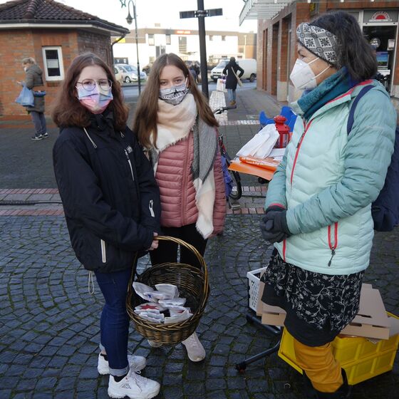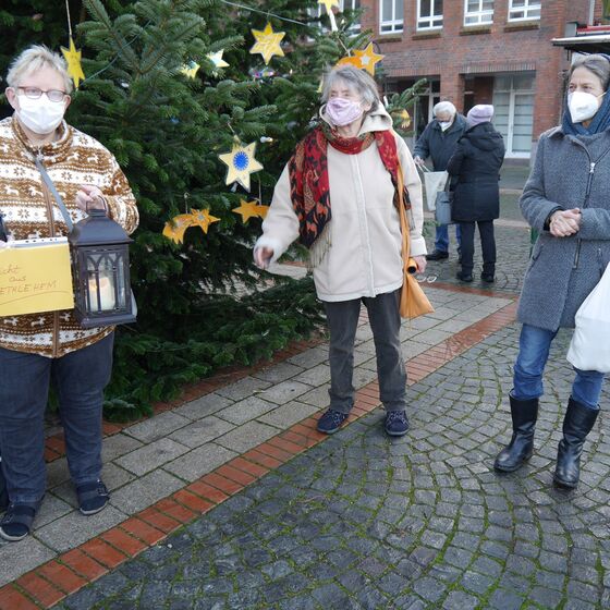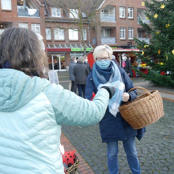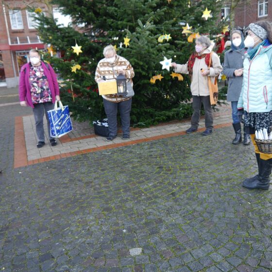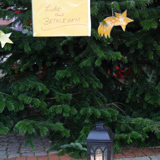 Vor dem 4. Advent haben u.a. Konfirmandinnen Weihnachtsgrüße der Kirchengemeinde auf dem Marktplatz verteilt. Es konnten Artikel am Eine-Welt-Stand erworben werden und das Licht von Bethlehem wurde am Tannenbaum aufgestellt. Fotos: M. Kloppenburg