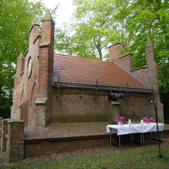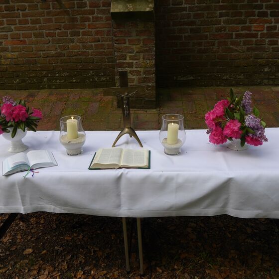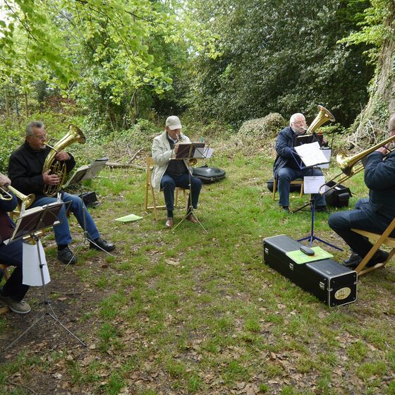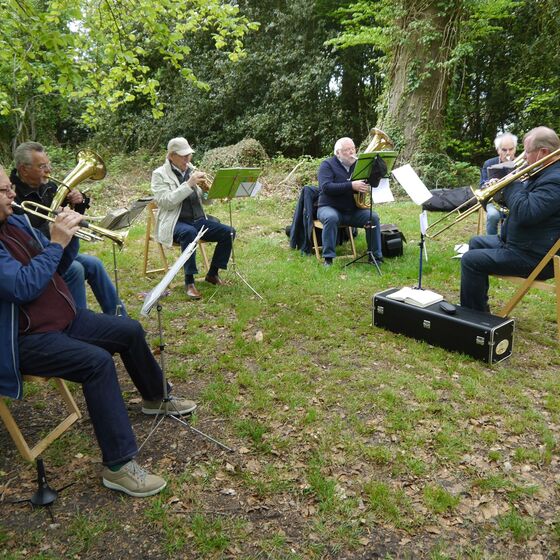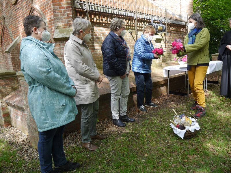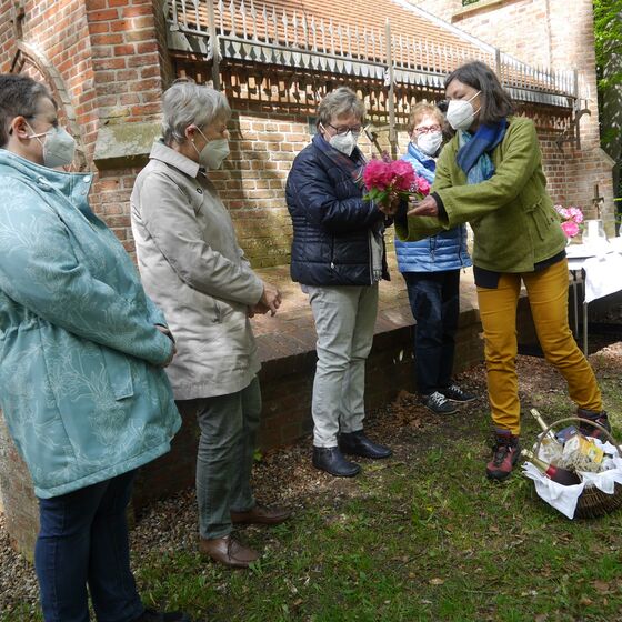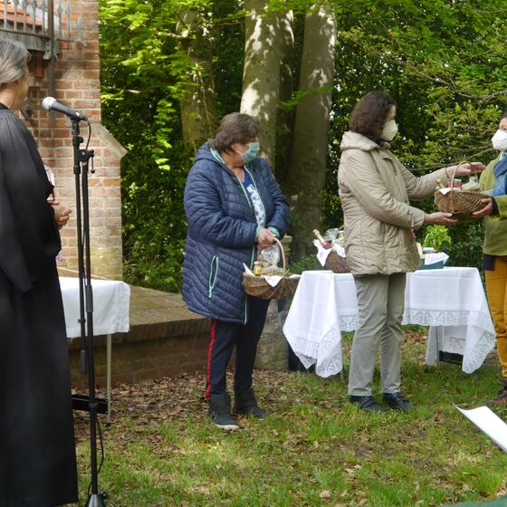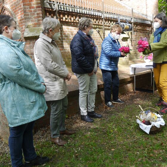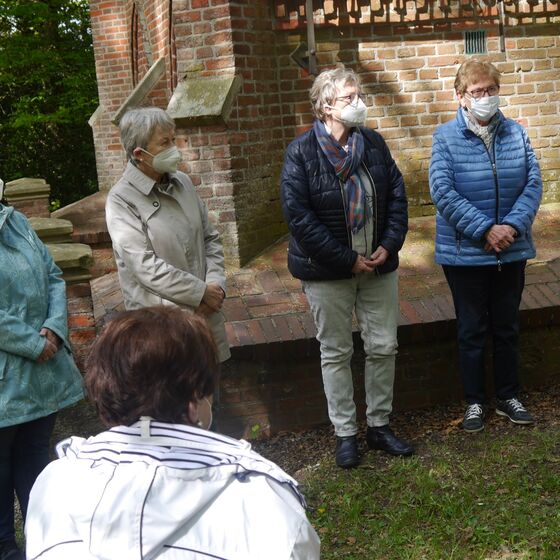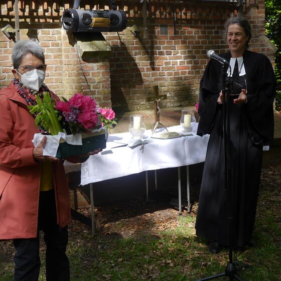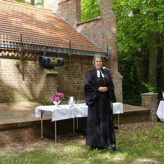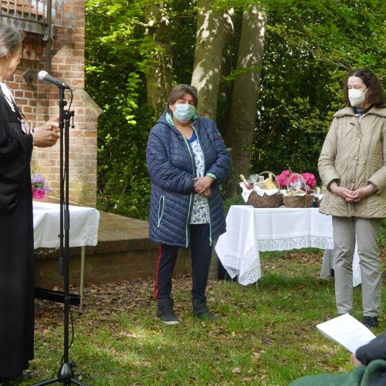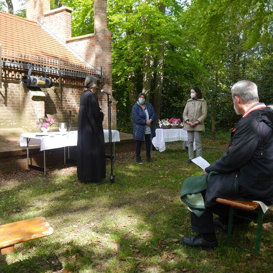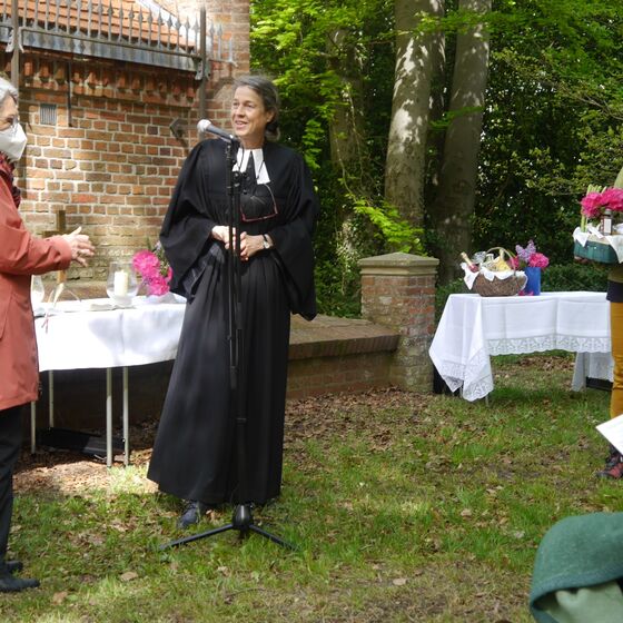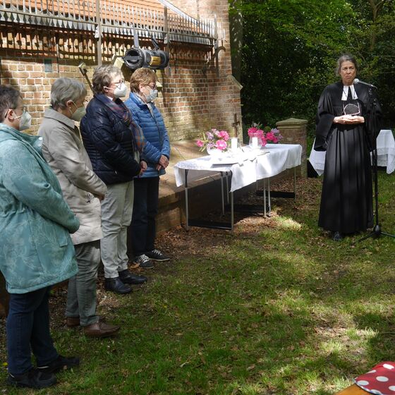 Am Himmelfahrtstag fand der Gottesdienst im Freien unter Mitwirkung von Pastorin Servatius und dem Posaunenchor am Mausoleum am Spreeken statt. Mitarbeiterinnen wurden geehrt. Fotos: M. Kloppenburg