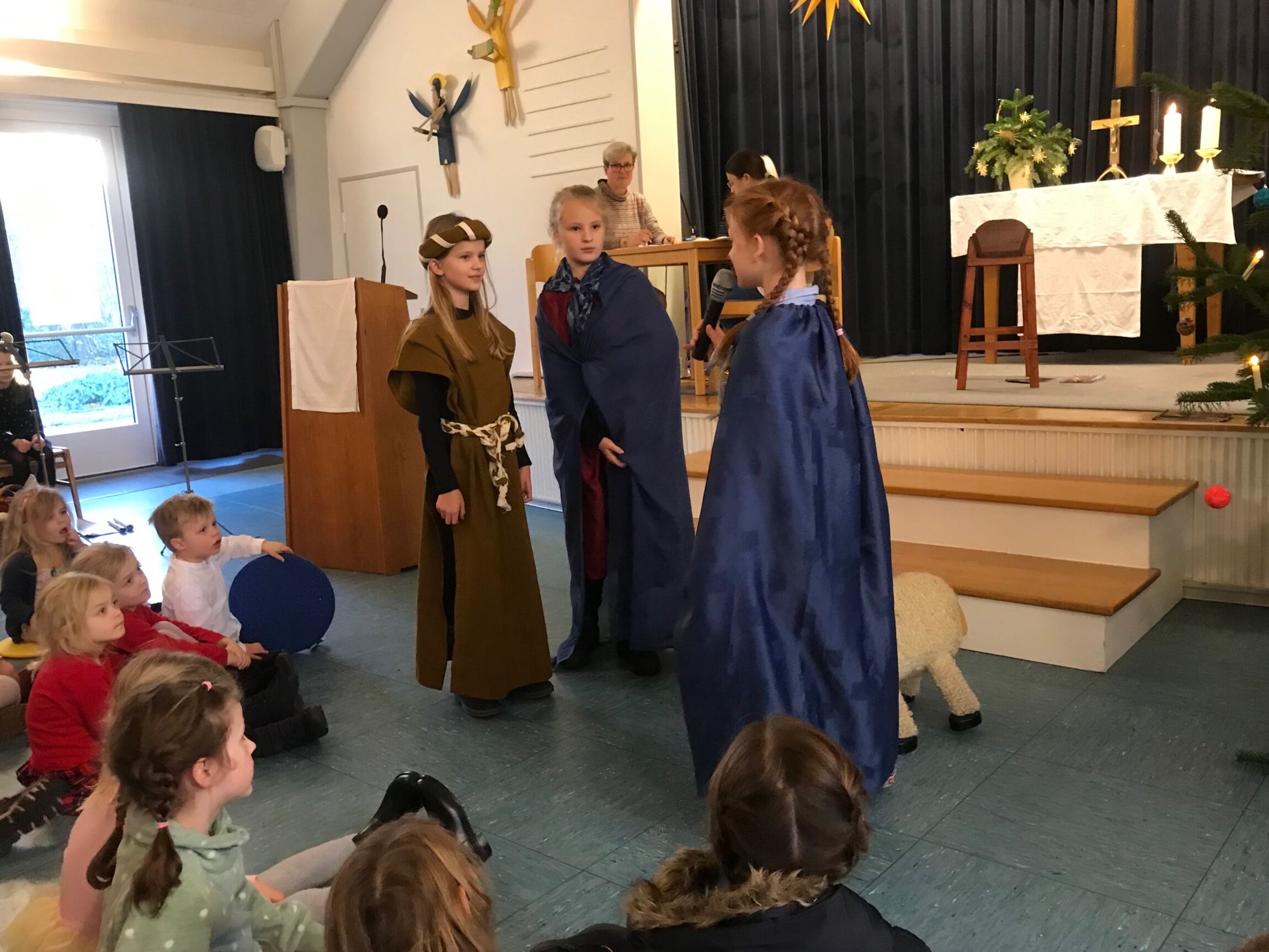 Diakon Sinke, das Kindergottesdienst-Team und die Flötengruppe von Frau Schwarz gestalten den Gottesdienst mit Krippenspiel im Gemeindehaus am Heiligabend