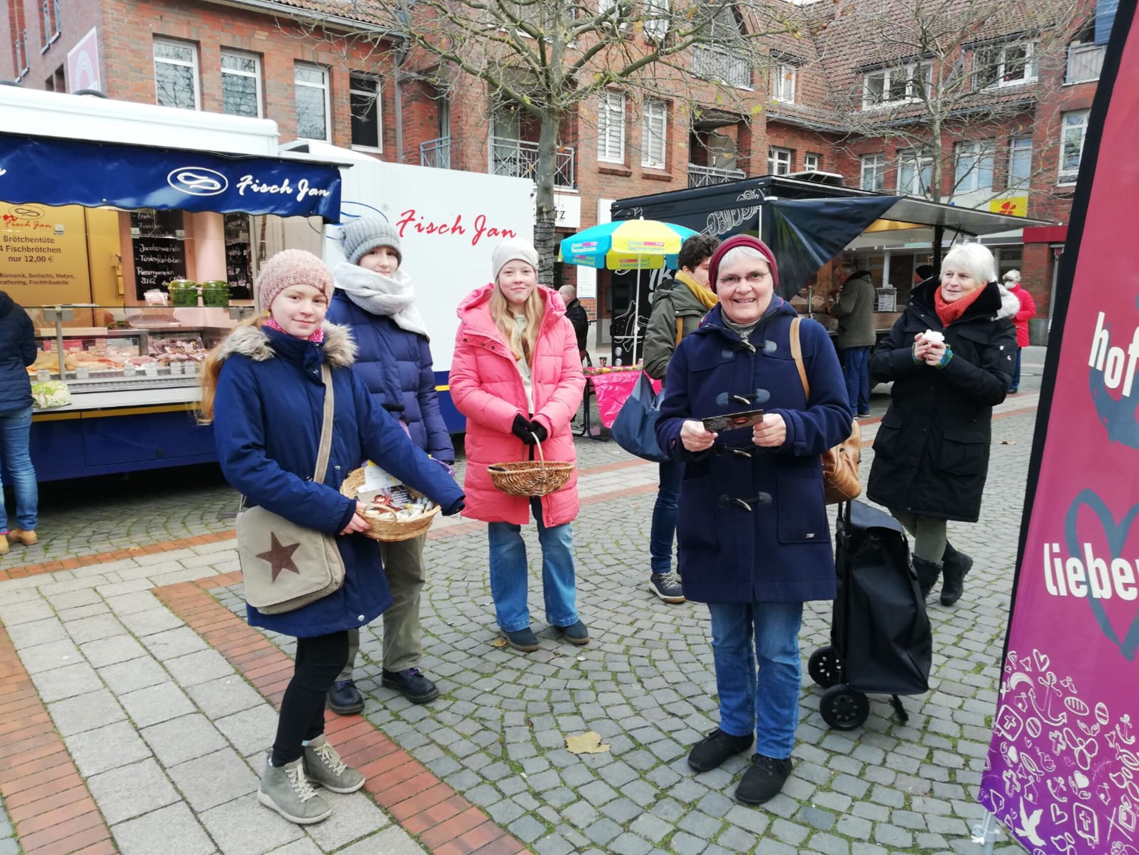 Am Samstag vor dem 3. Advent haben Ehrenamtliche und Konfirmandinnen Grußkarten und Süßigkeiten auf dem Marktplatz verteilt.