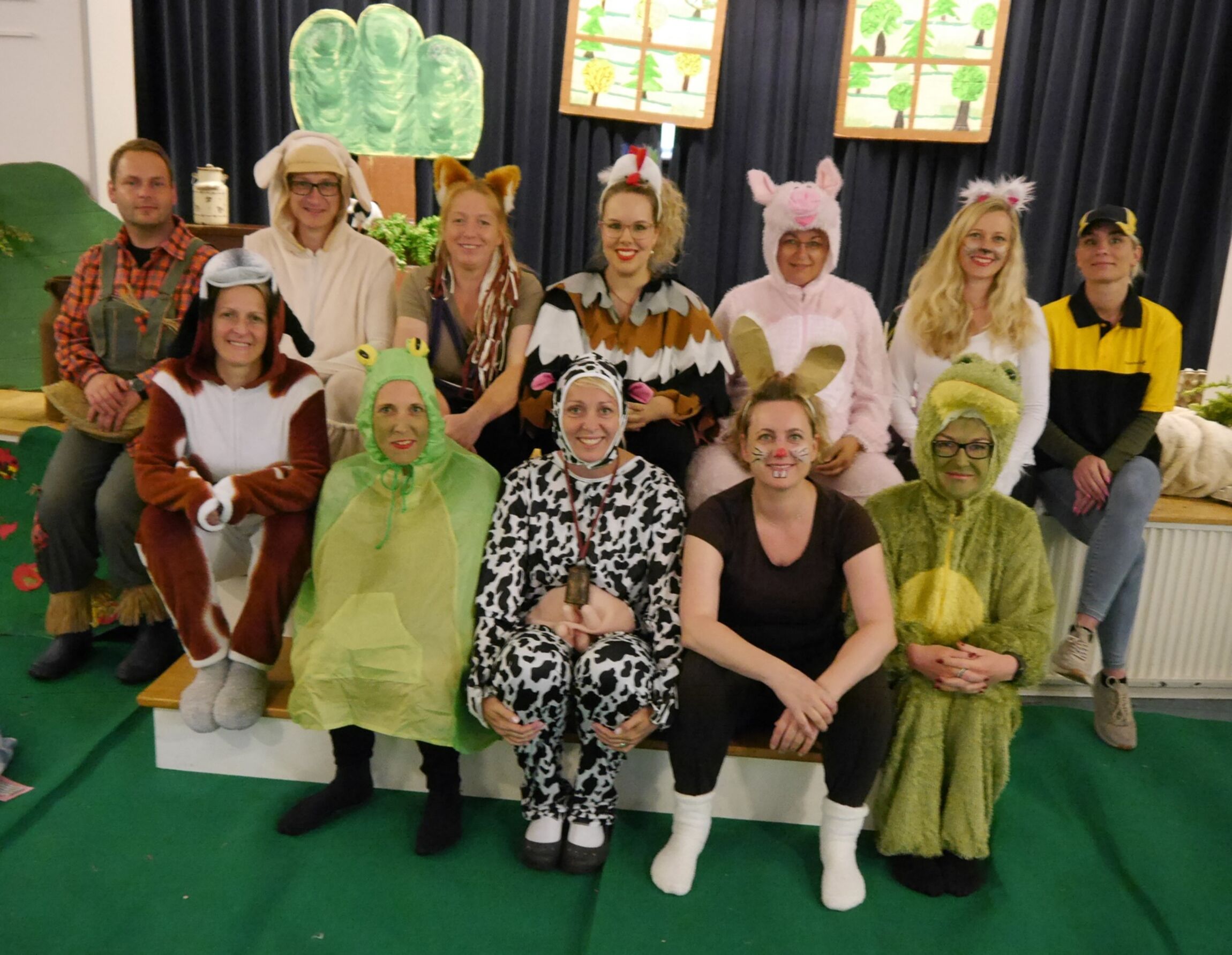 JoKi-Eltern spielen das Stück "Was macht das Schwein auf dem Ei?" für alle Kinder des Joki am 8. Juli zum Abschluss des Kita-Jahres auf und verabschieden die Kita-Leitung Anke Kister mit Blumen in den Ruhestand.