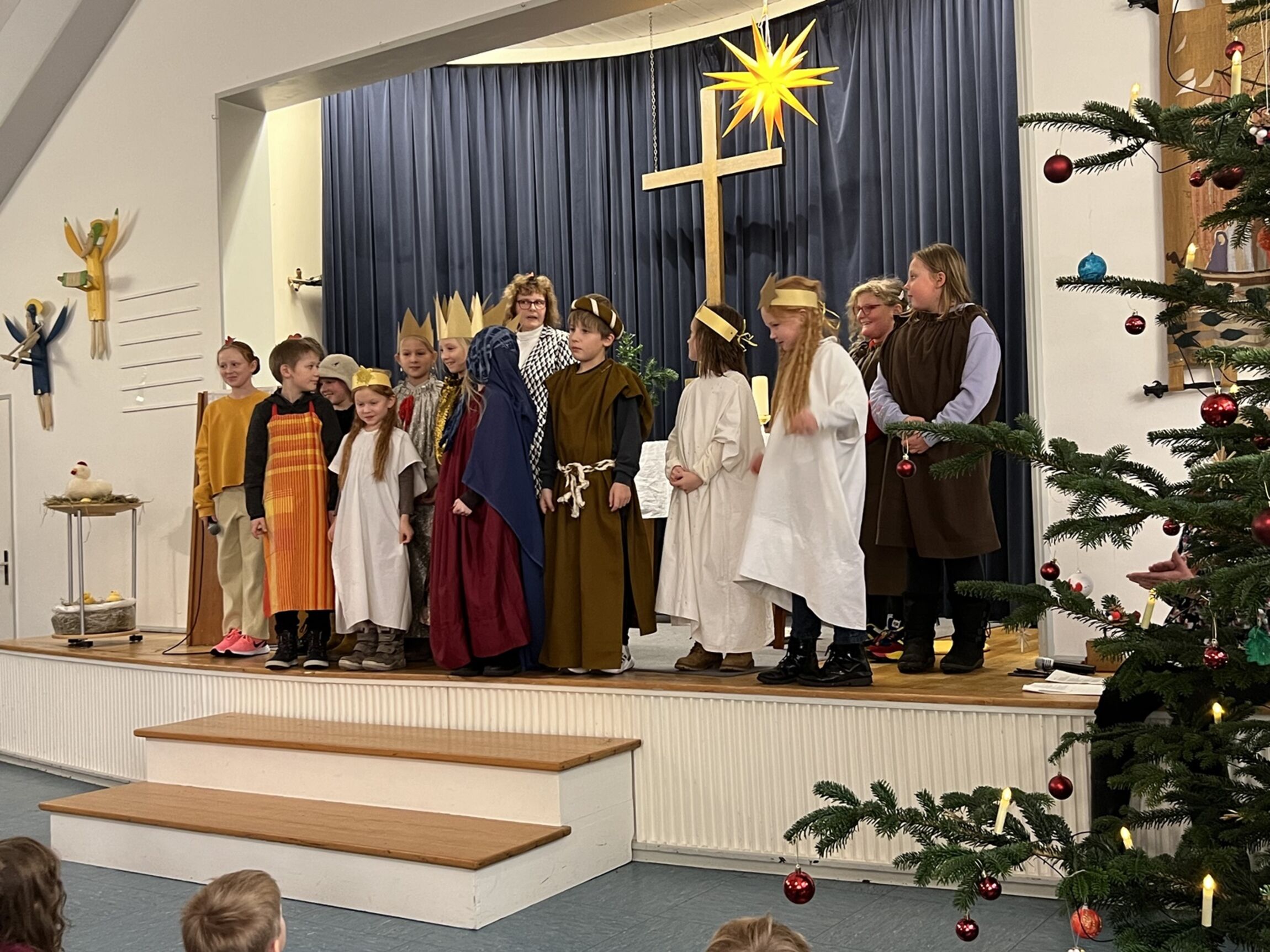 Im Gottesdienst im Gemeindehaus führen KInder unter der Leitung des KiGoDi-Teams ein Krippenspiel auf. Frau Schwarz und ihre Flötengruppe begleiten den Gottesdienst musikalisch. Die Leitung hat Diakon Tony Sinke.